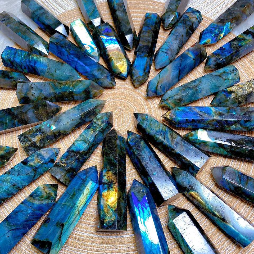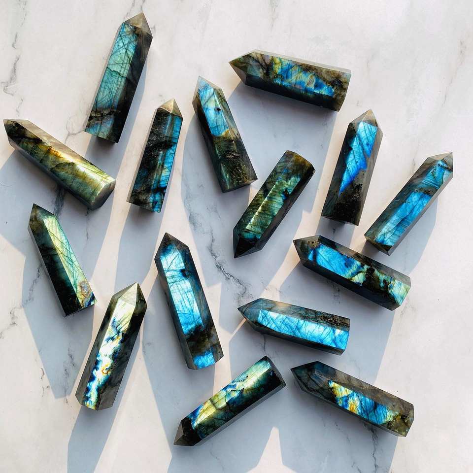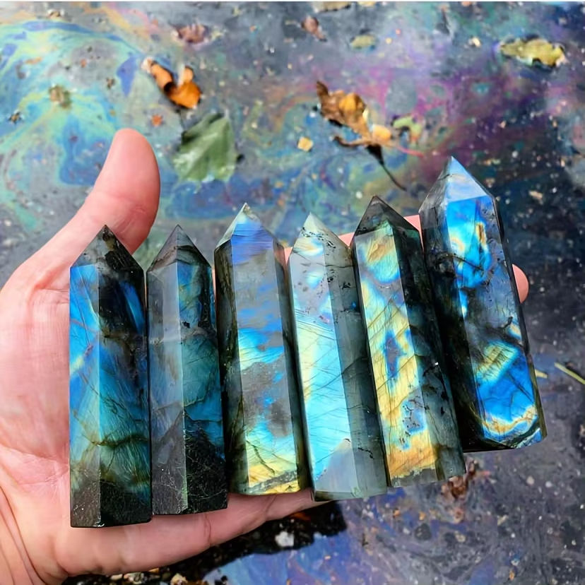 แท่งควอตซ์เรืองแสงสีรุ้งผลิตจากโรงงาน หินลาบราดอไรต์ปลายแหลม สำหรับตกแต่งเพื่อการบำบัดและตกแต่งภายใน