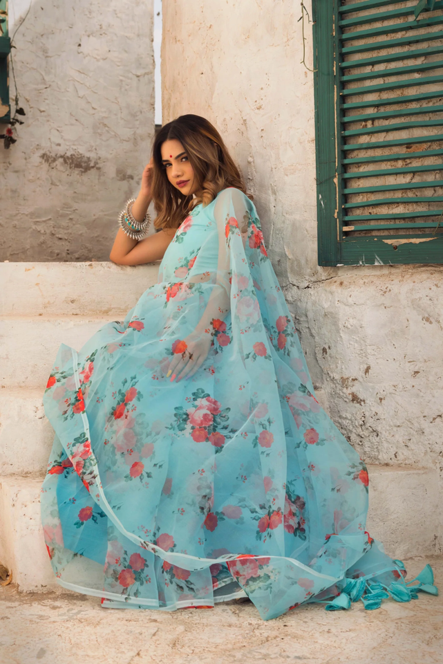CHAAND BLUE & RED ORGANZA SAREE