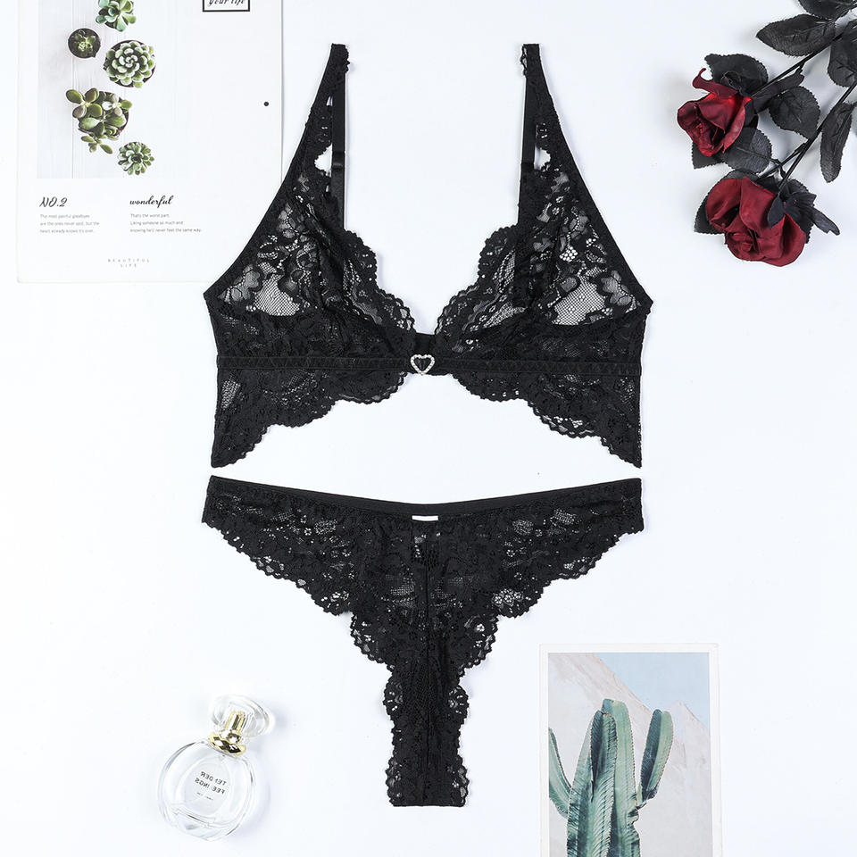 โรงงานขายชุดชั้นในรูปหัวใจสุดโรแมนติกแบบขายส่ง ชุดบราและกางเกงในลูกไม้บางสองชิ้น