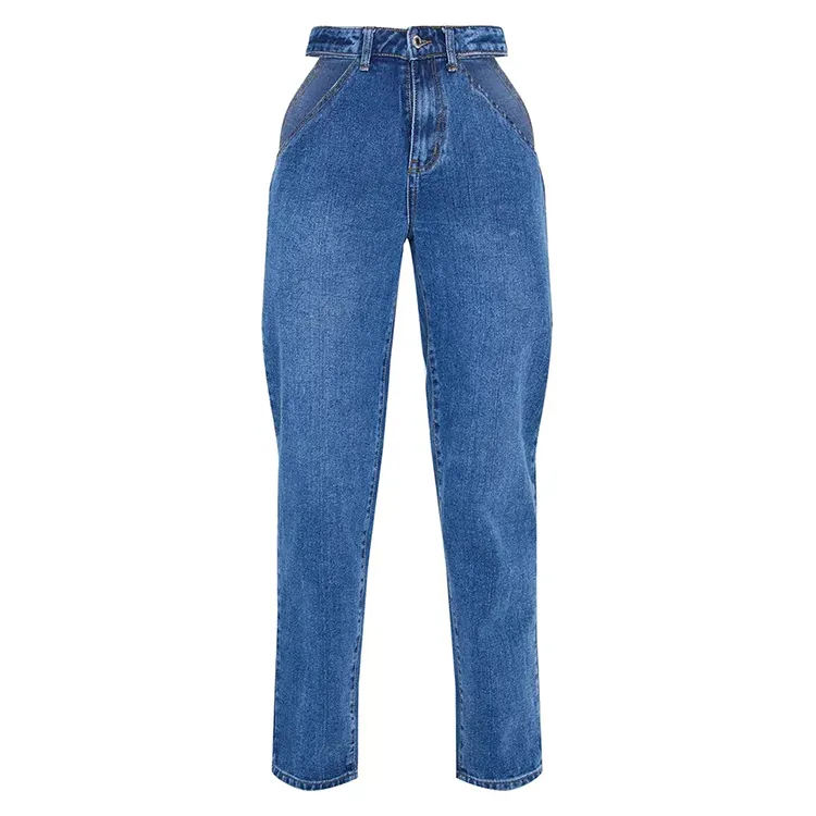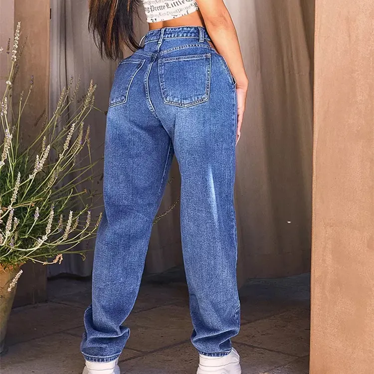 กางเกงยีนส์เอวสูงสไตล์ฮิปฮอปของผู้หญิงกางเกงยีนส์ทรงตรงติดโลโก้แบบเรียบง่าย