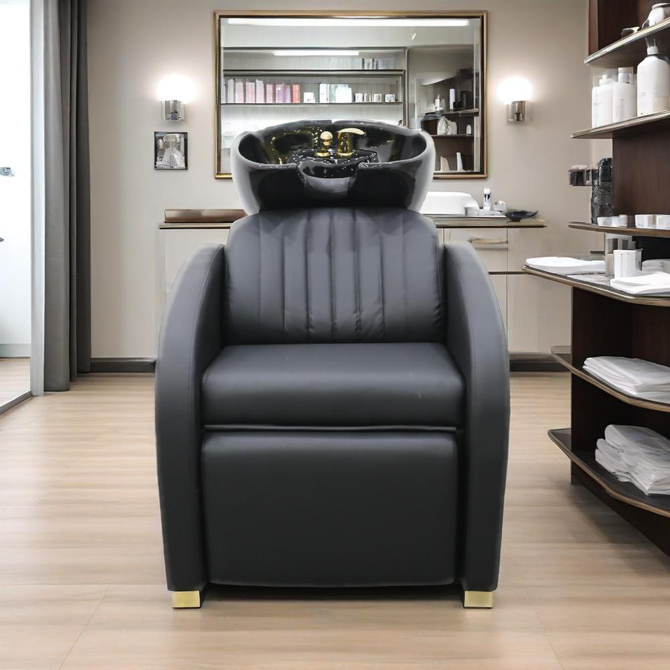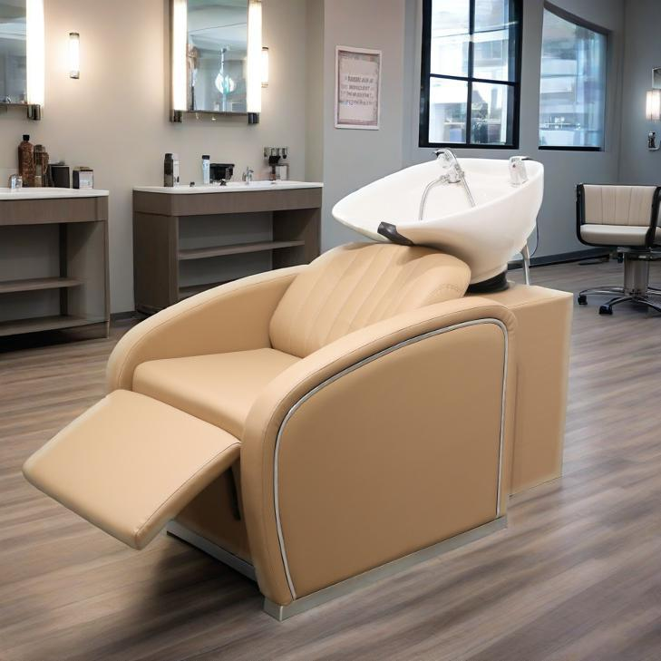 สถานีสระผมดีไซน์ทันสมัยจากโรงงาน, เก้าอี้สระผมสำหรับร้านเสริมสวย เตียงสระผมหุ้มหนัง PU พร้อมอ่างเซรามิก