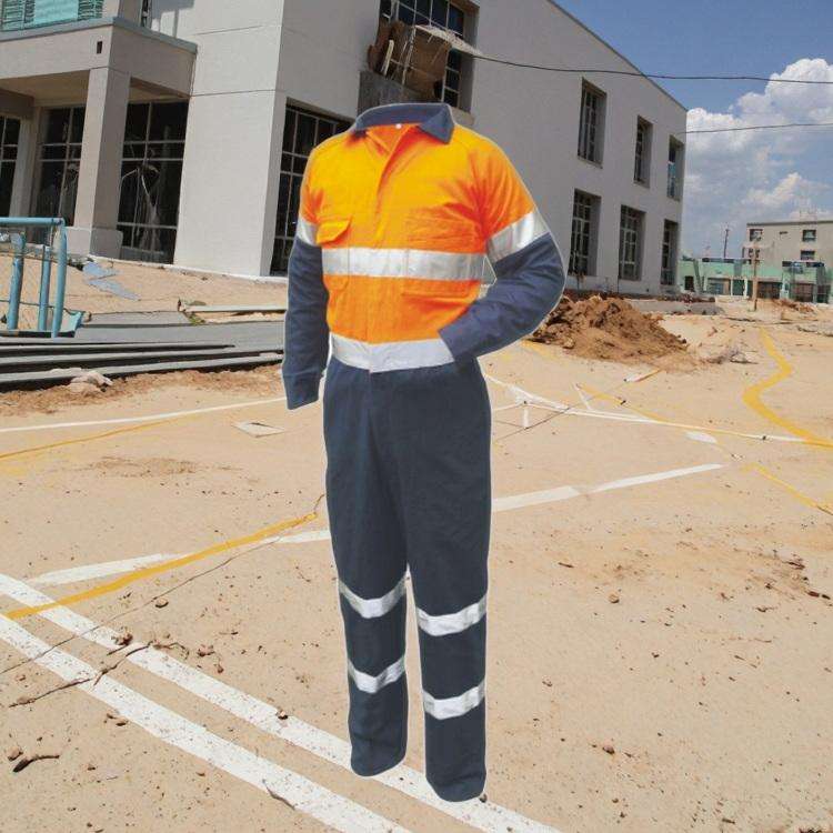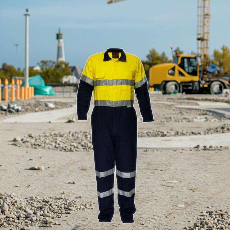 ชุดทำงานผ้าคอตตอน100% สีเหลือง/น้ำเงินทูโทนหนึ่งชิ้นสะท้อนแสงความปลอดภัยสูงชุดทำงานก่อสร้างมองเห็นได้ชัดเจน