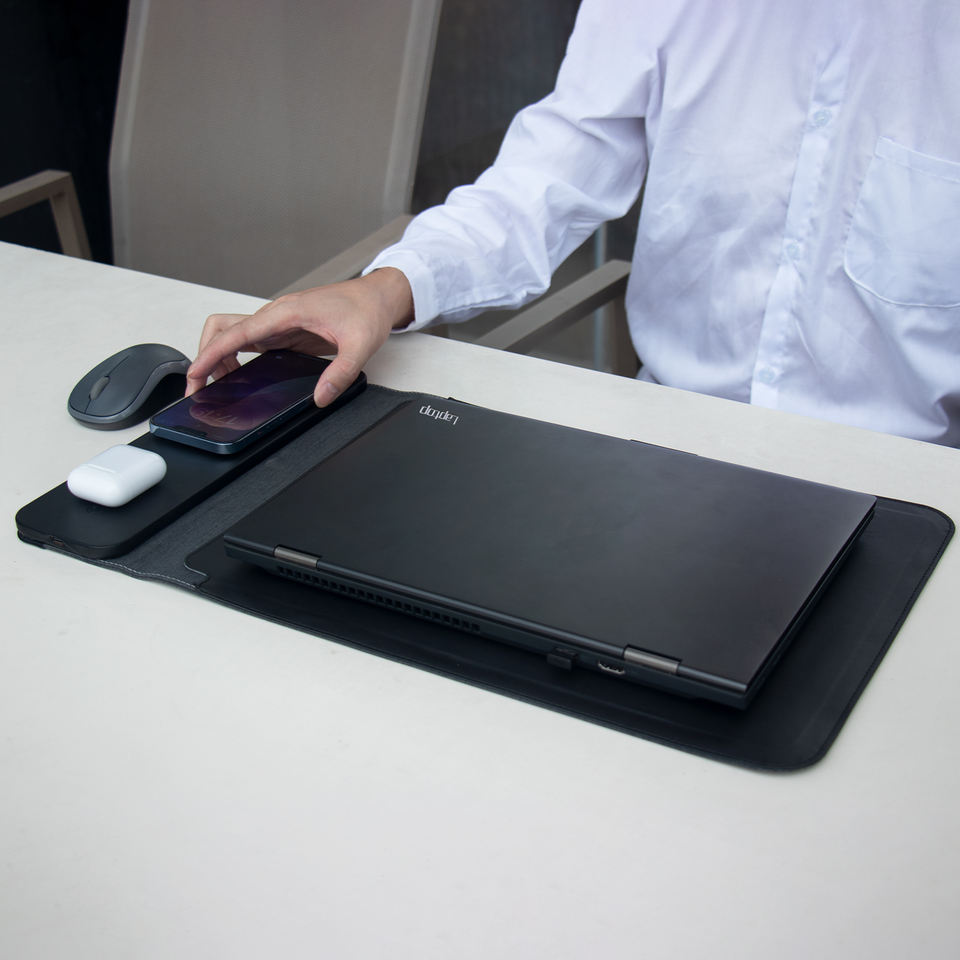 แผ่นรองเมาส์แบบไร้สาย14นิ้ว16นิ้วกระเป๋าหนัง PU สำหรับแล็ปท็อปพร้อมที่ชาร์จไร้สายสำหรับโทรศัพท์มือถือ15วัตต์