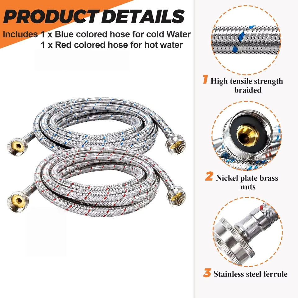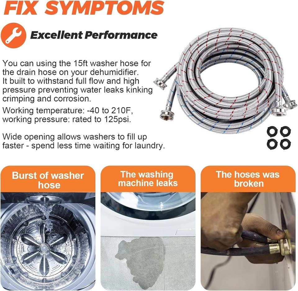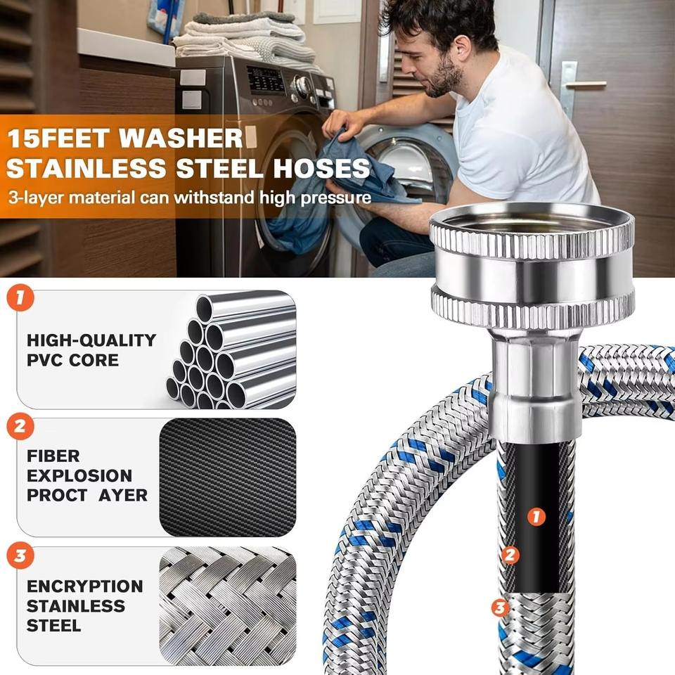 ความยาว 15 ฟุต: ให้ความยาวเพียงพอสำหรับการติดตั้งอย่างยืดหยุ่นในสภาพแวดล้อมต่าง ๆ ทำให้เชื่อมต่อกับเครื่องซักผ้าและแหล่งน้ำได้ง่าย