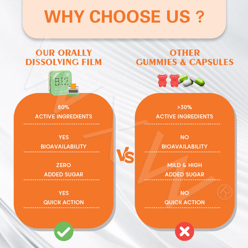แถบฟิล์ม B12ที่ละลายได้สำหรับการสนับสนุนพลังงาน B12แถบฟิล์มบางๆในช่องปากภูมิคุ้มกันและอาหารเสริม