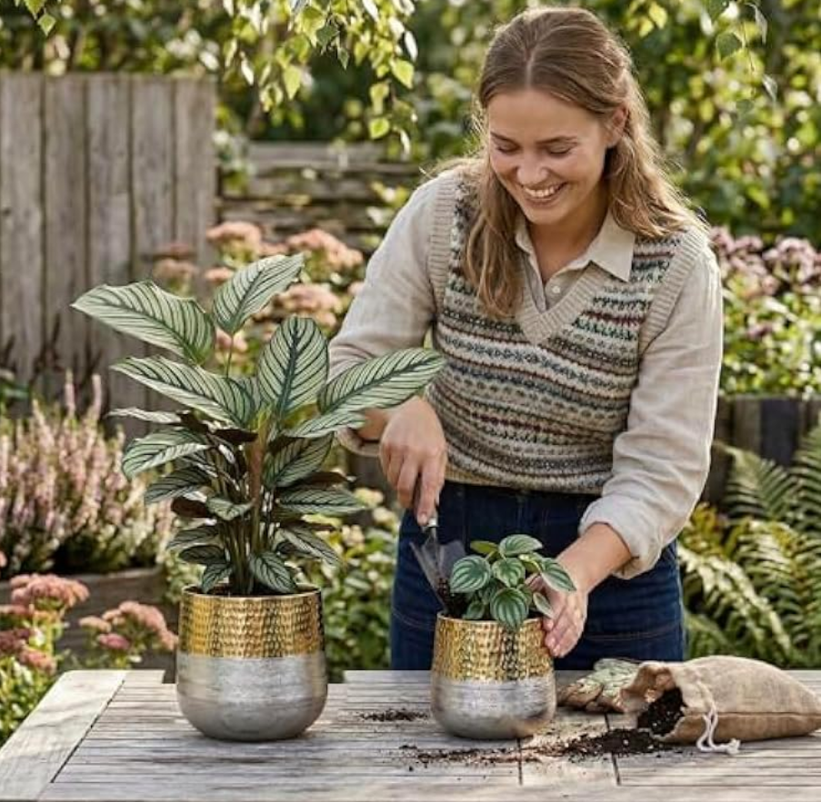 ชุดกระถางต้นไม้โลหะขอบทอง 2 ชิ้น สีทองและสีขาว ดีไซน์สวยงาม กระถางปลูกต้นไม้และกระถางต้นไม้ยอดนิยมสำหรับตกแต่งบ้าน