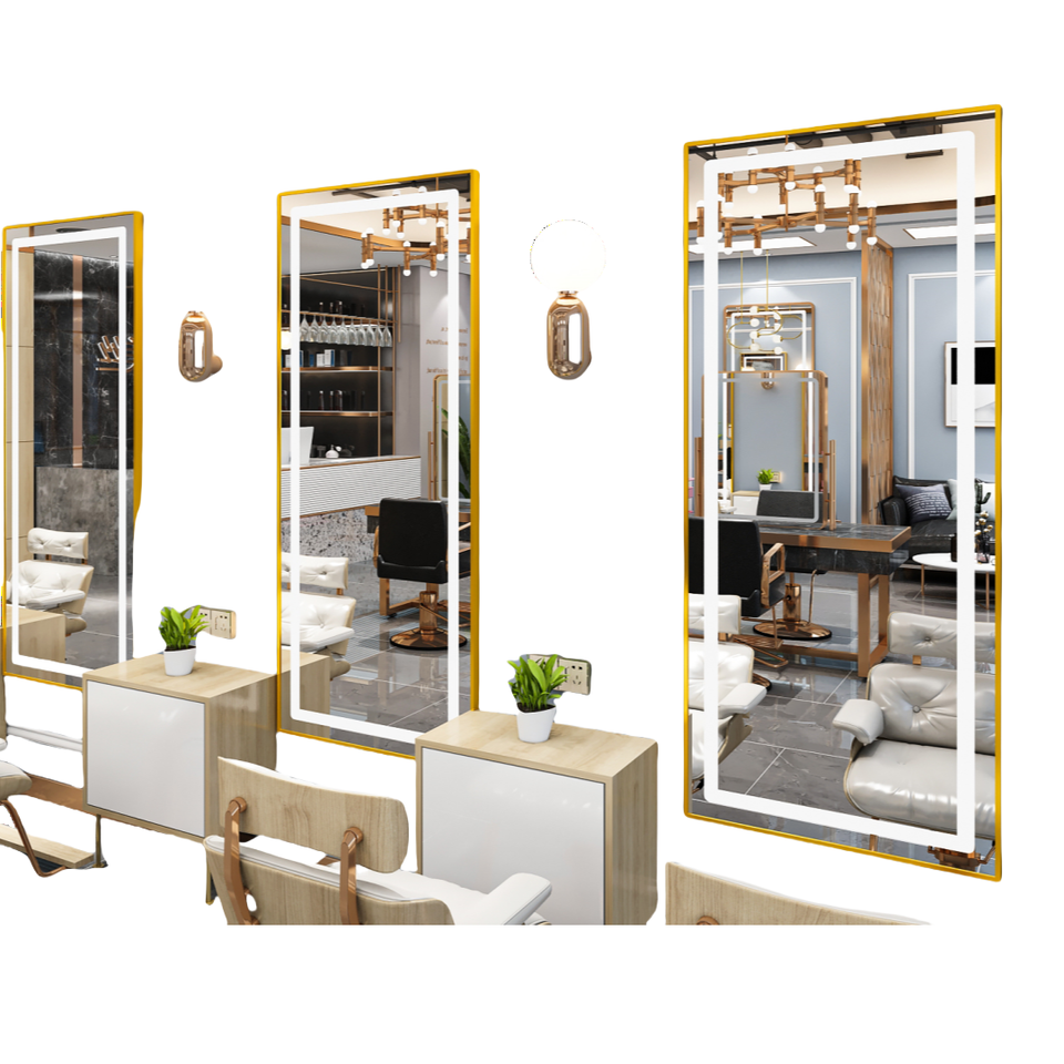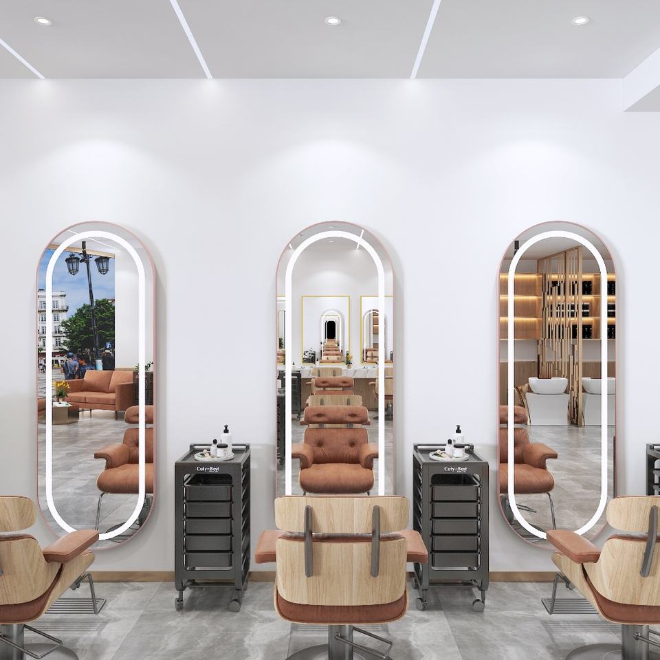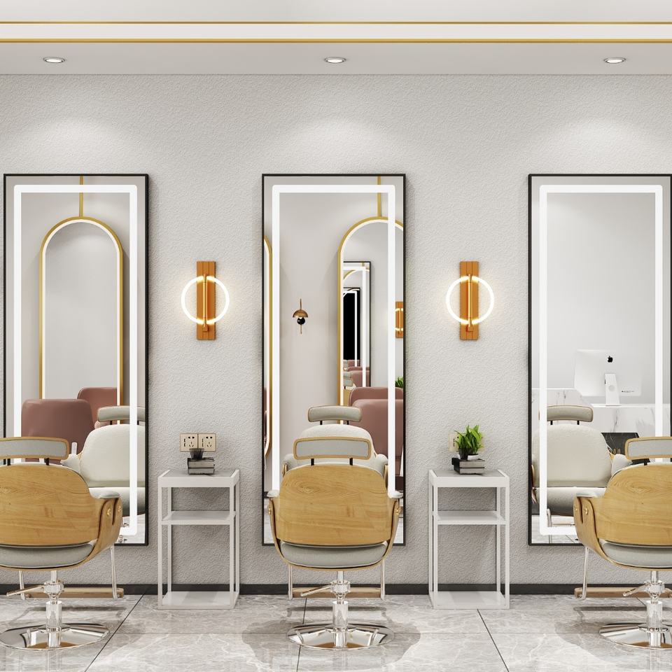 โรงงานซัพพลายรันเวย์/สี่เหลี่ยมผืนผ้า/รูปโค้งเต็มความยาวร้านทําผม LED กระจกร้านตัดผมกระจก LED พร้อมไฟปรับได้