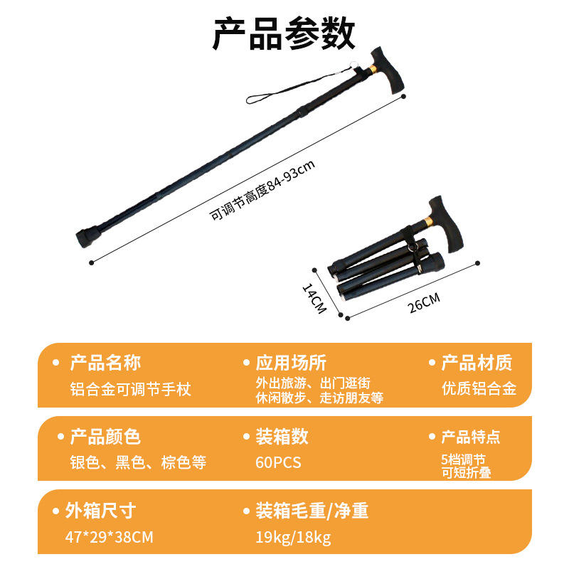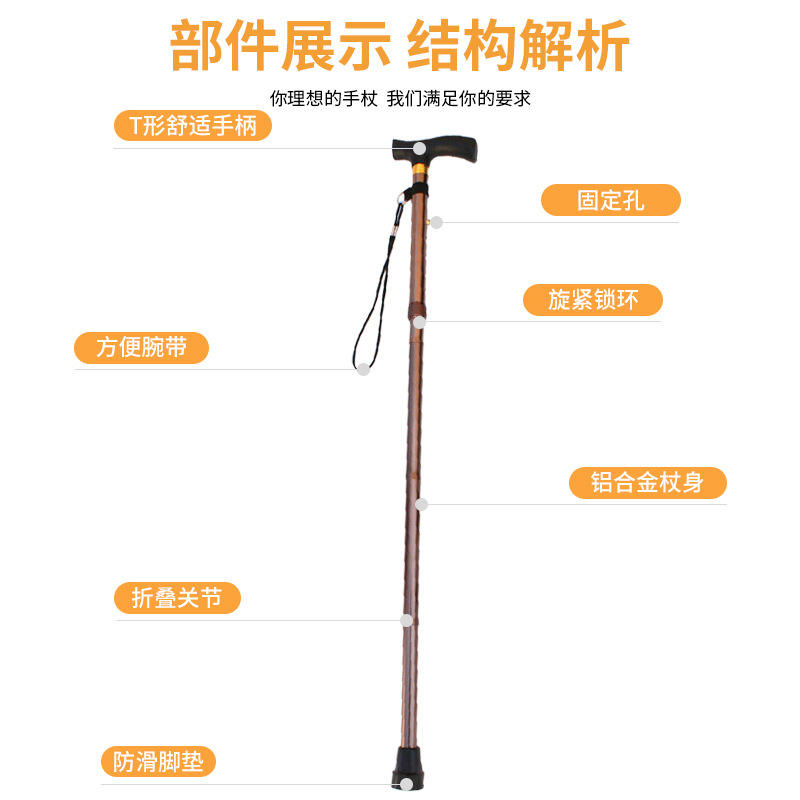 ไม้เท้าพับได้ทำจากอลูมิเนียมอัลลอยด์หนาพิเศษ ด้ามจับรูปตัว T ปรับความยาวได้ 4 ระดับ พร้อมปลายยาง