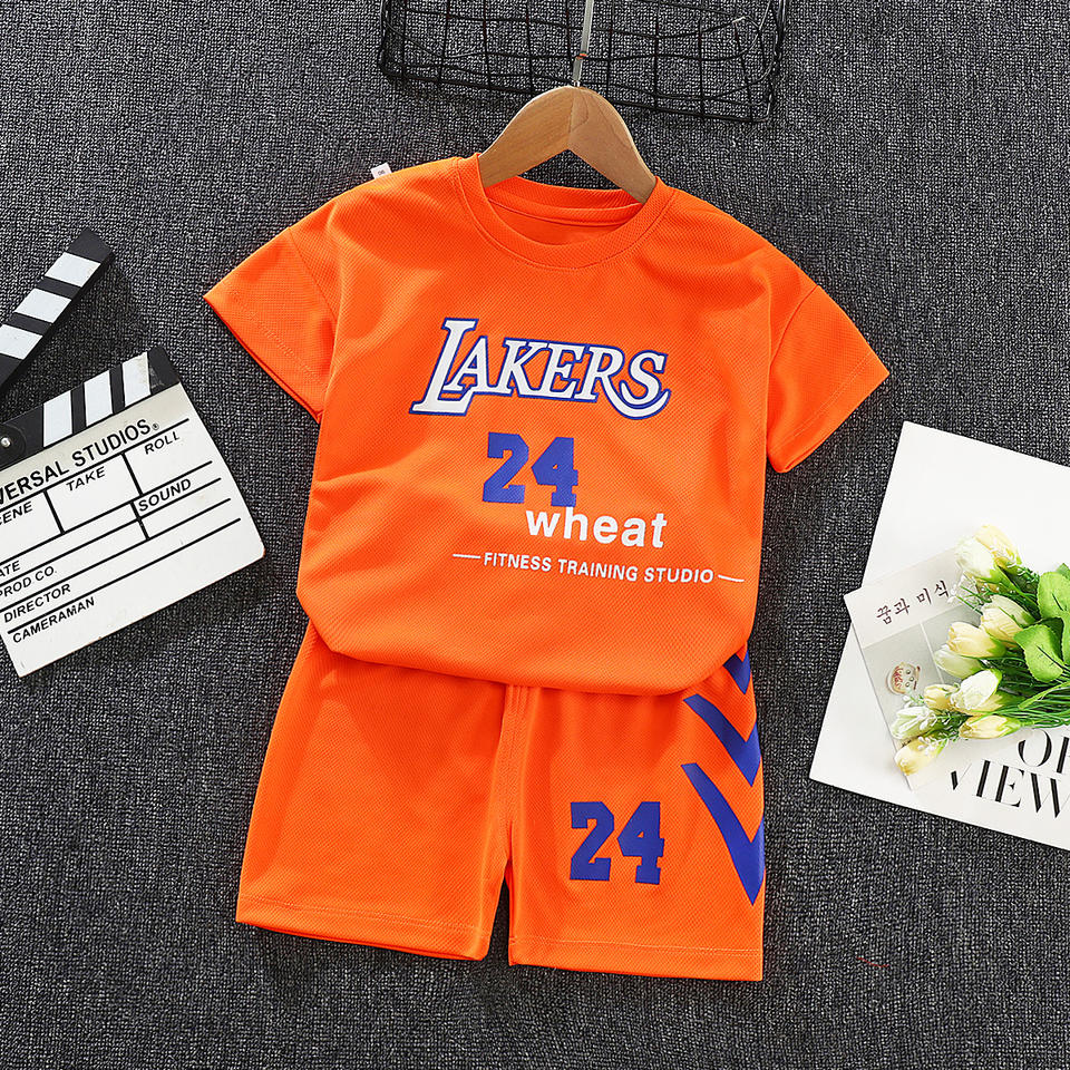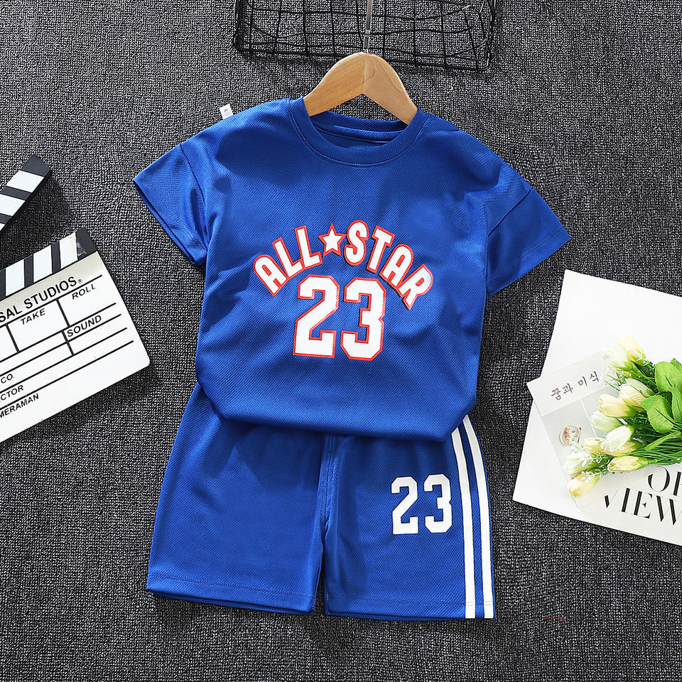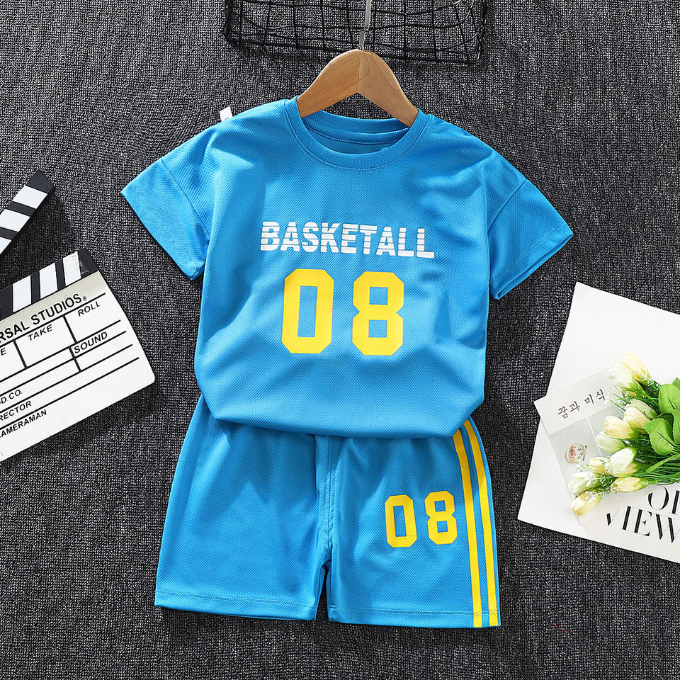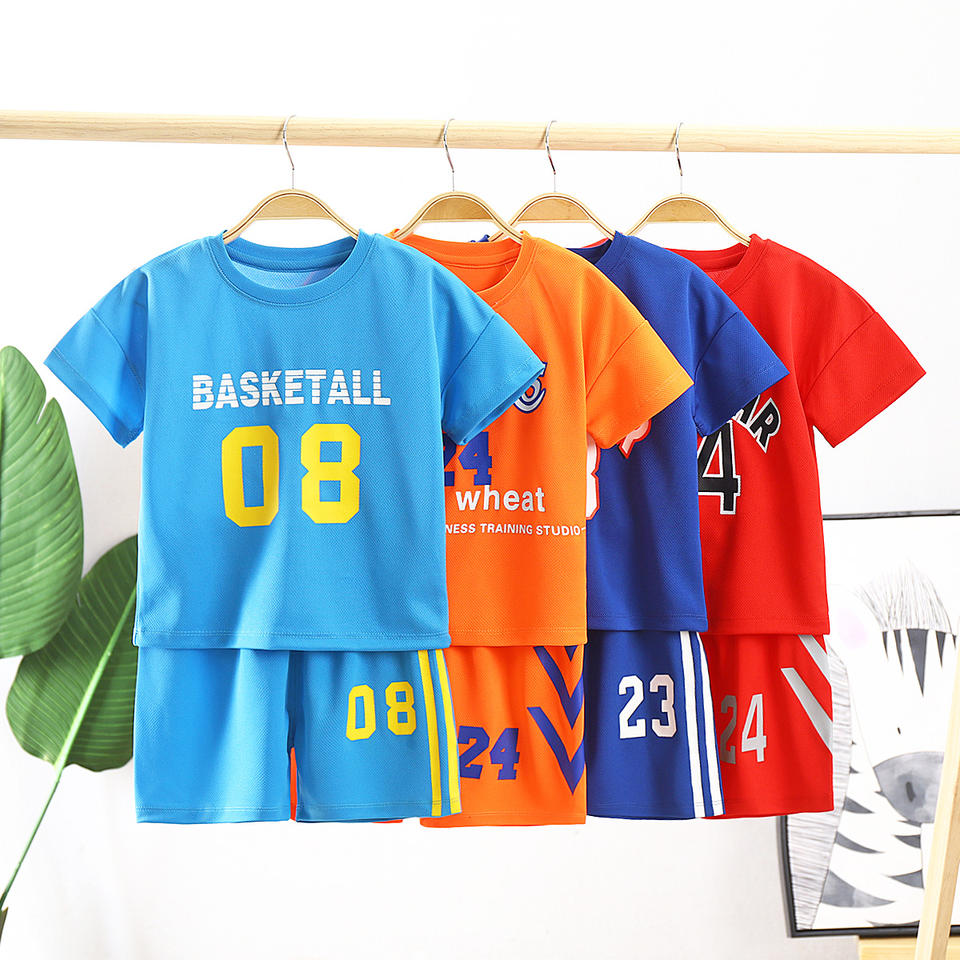 ชุดบาสเก็ตบอลเด็กพิมพ์ลายระบายอากาศดีราคาถูกขายส่งจากโรงงาน กางเกงขาสั้นแขนสั้นทรงหลวม