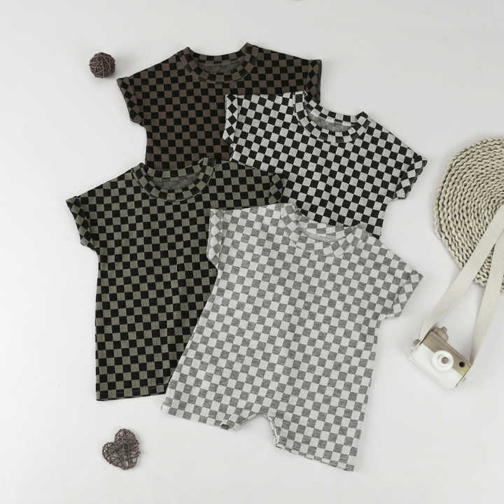 ชุดรอมเปอร์เด็กอ่อนลายตารางหมากรุกขายส่งจากโรงงาน แขนสั้น