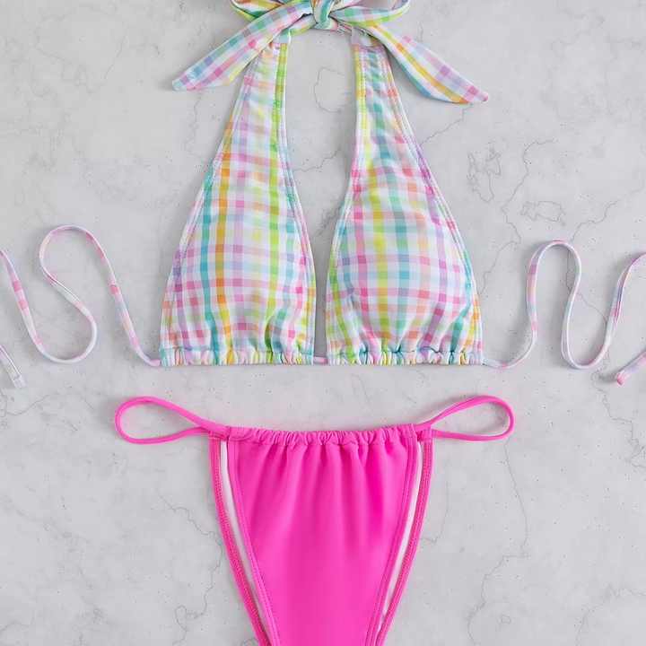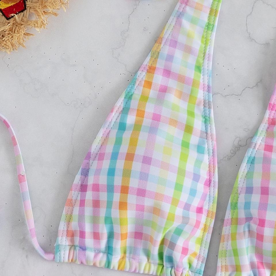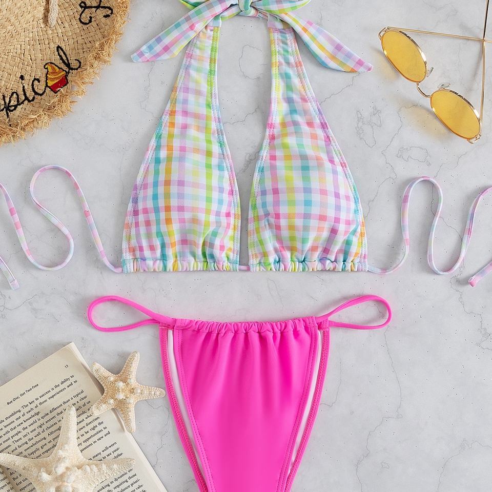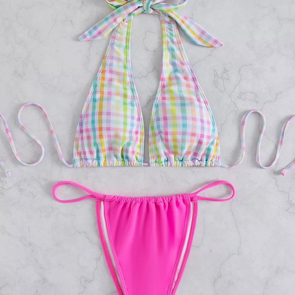ชุดบิกินี่ผู้หญิงไซส์ใหญ่สั่งทำขายส่งจากโรงงาน แบบวีสตริง ไมโครบรา ไร้สายรัดหลัง ลายพิมพ์ ป้องกันแบคทีเรีย แห้งเร็ว