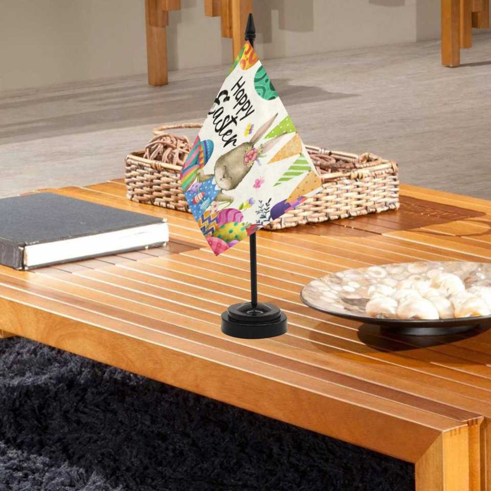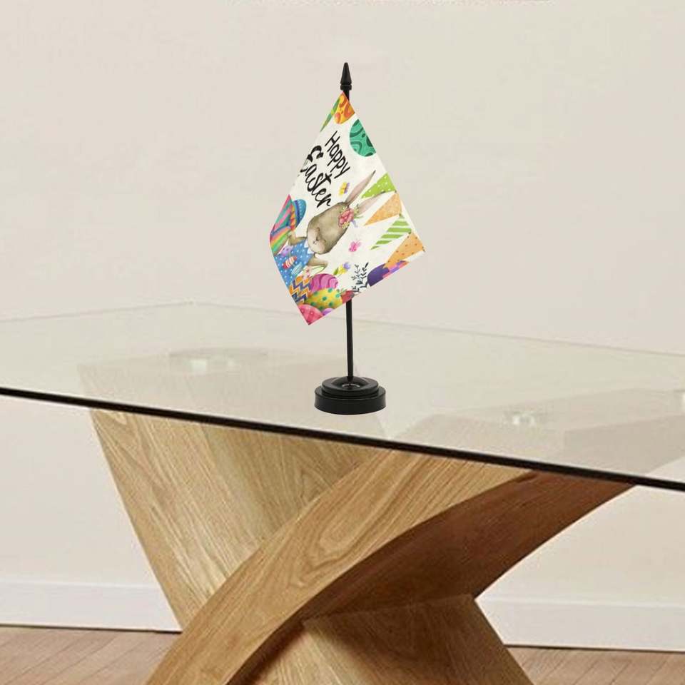 ธงตั้งโต๊ะเทศกาลอีสเตอร์ขายส่งจากโรงงาน ขนาด 8.3x5.5 นิ้ว พร้อมฐาน ABS สีดำขนาดเล็ก และธงโพลีเอสเตอร์แบบปรับแต่งได้