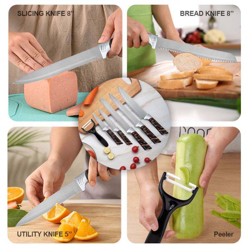 ชุดมีดครัวขายส่งจากโรงงาน พร้อมด้ามจับหุ้ม 6 ชิ้น มีดเชฟ มีดหั่นผักผลไม้ มีดสเต็กคมแบบหยัก