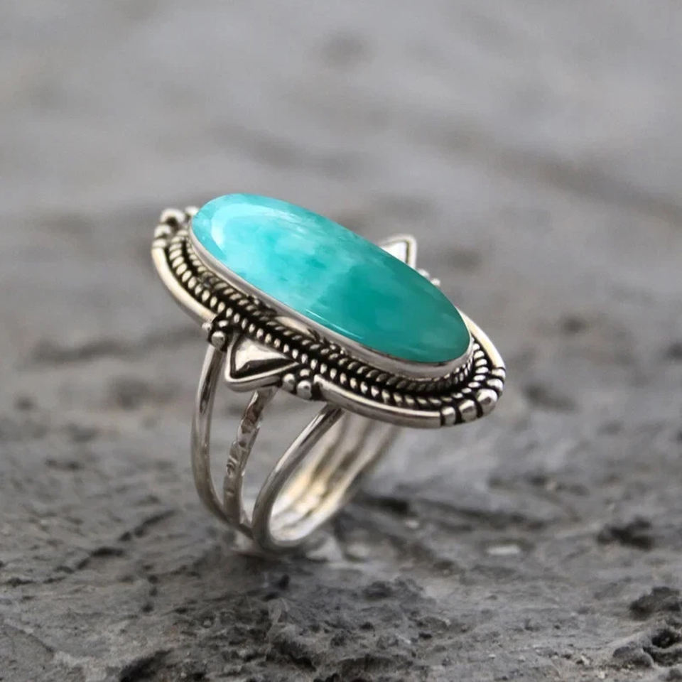 แหวนอะเมโซไนต์ธรรมชาติขายส่งจากโรงงาน เงินแท้ 925 ทำมือ พลอยทรงรี 10x18 มม. เครื่องประดับสไตล์โบฮีเมียนสำหรับวันครบรอบ