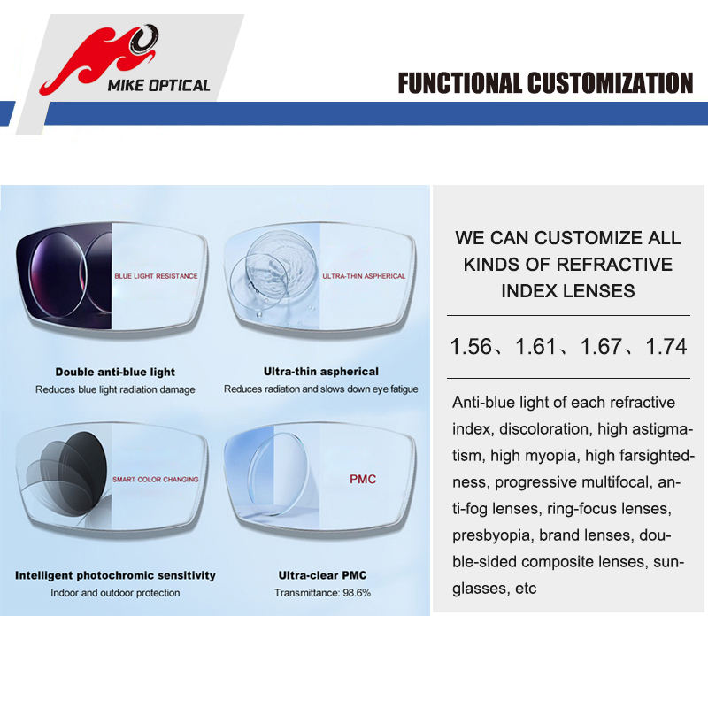 เลนส์แว่นตาโค้งฐาน2C เคลือบสีฟ้าแบบชิ้นเดียวจากเรซิน