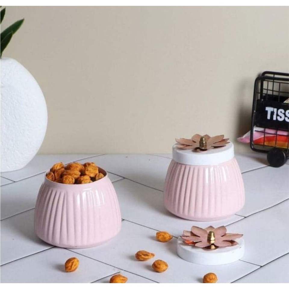 กระป๋องใส่อาหารโลหะลายทางสีชมพูขายส่งจากโรงงาน | ฝาโลหะรูปดอกบัว กระถางเก็บของโลหะ | ขวดใส่ถั่วและผลไม้อบแห้งแบบกำหนดเองได้