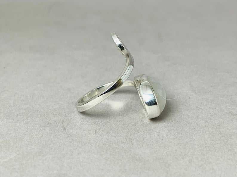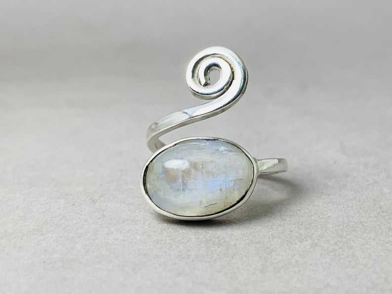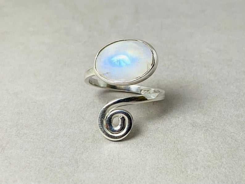 แหวนพลอยมูนสโตนสีรุ้งแบบมินิมอลเครื่องประดับวินเทจ925เงินแท้เครื่องประดับดีไซน์แบบเกลียว