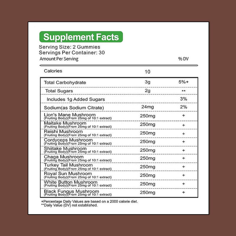 ส่วนผสมหลัก:เห็ดแผงคอสิงโต, เห็ดไมทาเกะ, เห็ดหลินจือ, เห็ด Cordyceps, เห็ดชิตาเกะ, เห็ด Chaga, เห็ดหางไก่งวง, เห็ดหลวงดวงอาทิตย์, สีขาวกระดุม, เห็ดเชื้อราดำ