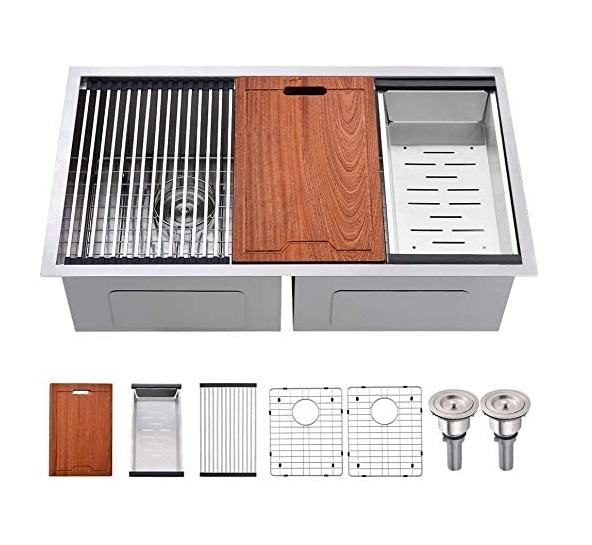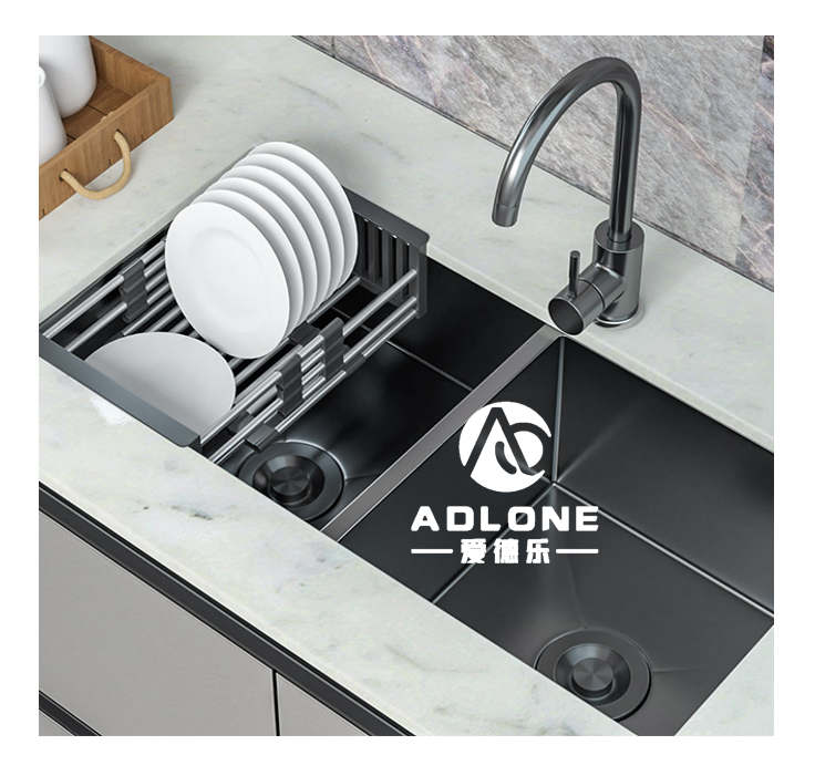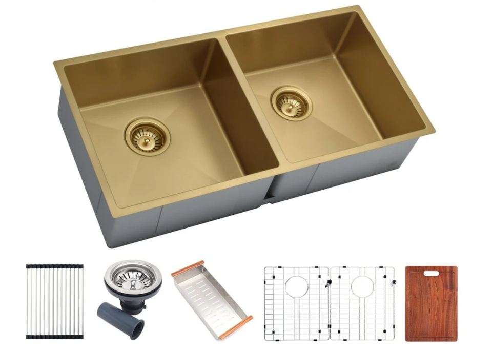 อ่างล้างจานสแตนเลสทรงสี่เหลี่ยมแบบสองหลุมเคลือบซาตินนาโนสีทอง ผลิตด้วยมือ ขายส่งจากโรงงาน พร้อมก๊อกน้ำแบบติดตั้งใต้เคาน์เตอร์