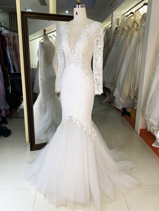 ชุดแต่งงานหรูหราผ้าทูลสีขาวขายส่งจากโรงงาน แขนยาวทรงเมอร์เมดหางปลา ปักลายสไตล์งานเลี้ยง พร้อมระบายช่วงเอวแบบธรรมชาติ