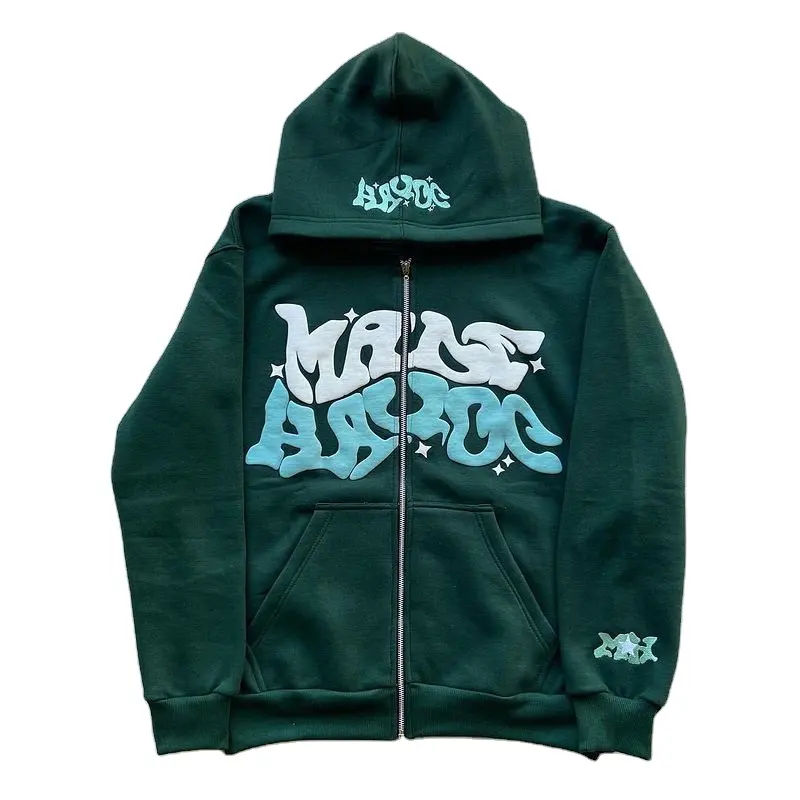 เสื้อฮู้ดโอเวอร์ไซส์ของผู้ชายพิมพ์ลายตัวอักษรทำจากโฟม3D คอเสื้อมีซิปรูดแบบกำหนดเอง Y2K โรงงาน