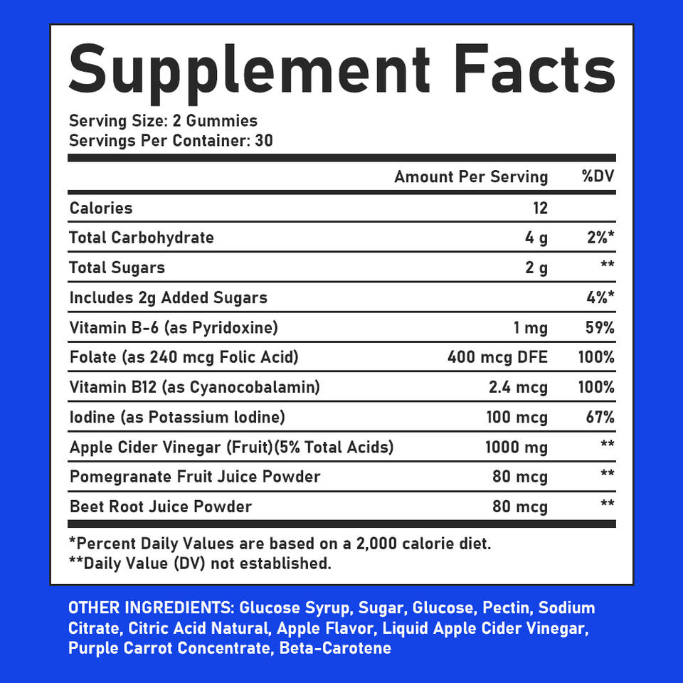 ส่วนผสมหลัก:น้ำส้มสายชูหมักจากแอปเปิล, โฟเลต, ไอโอดีน