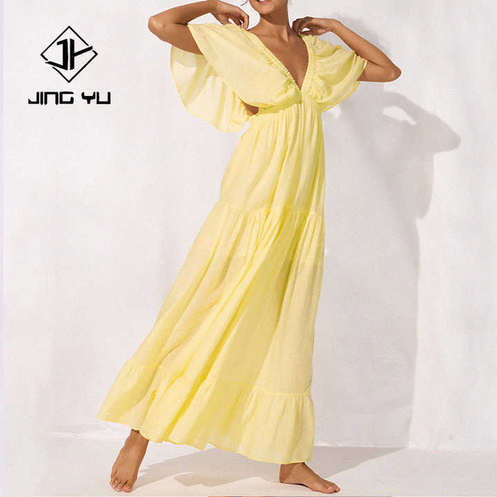 ชุดเดรสยาวหลายชั้น คอวีลึก ดีไซน์หรูหราและพลิ้วไหว ผลิตจากผ้าทูลล์คอตตอน 100% คุณภาพสูง