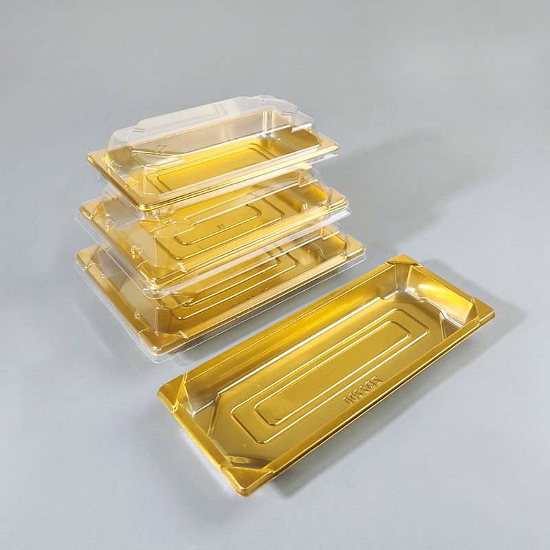 Togo ถาดใส่อาหารพลาสติกสีทองแบบใช้แล้วทิ้งพร้อมฝาปิดโปร่งใสป้องกันหมอก