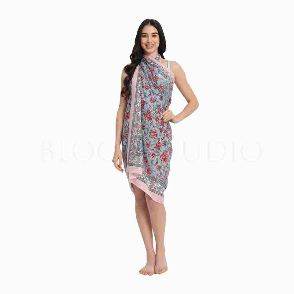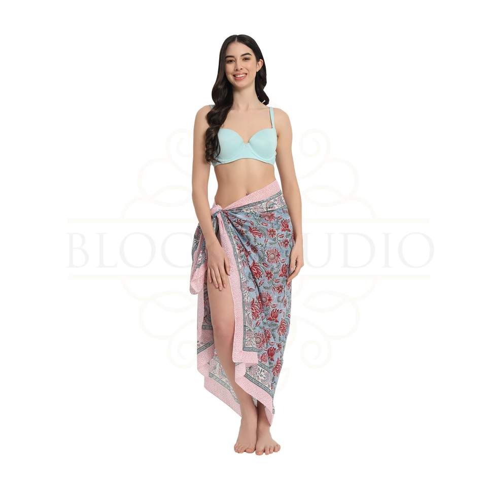 ผ้าซิ่นพิมพ์ลายมือสีแดงและชมพูบนผ้าเดนิมสีซีดจางสำหรับผู้หญิง ผ้าคลุมบิกินี่น้ำหนักเบา เหมาะสำหรับใส่ไปเที่ยวทะเลในช่วงฤดูร้อน