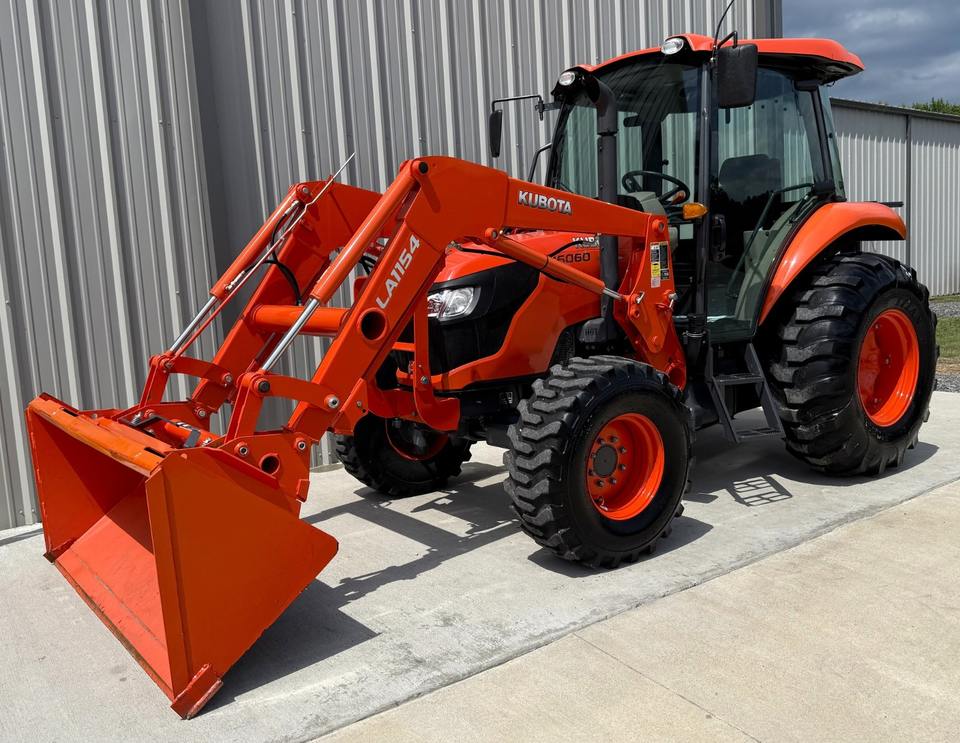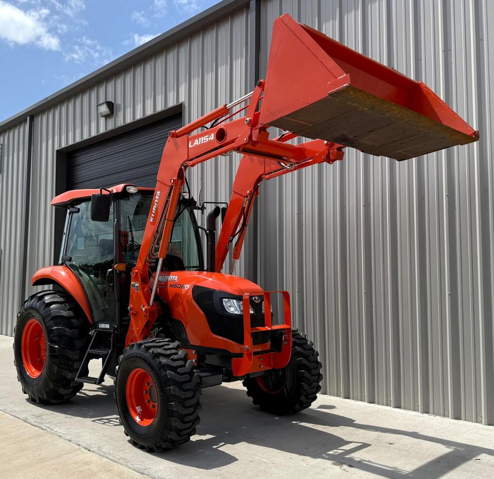 รถแทรกเตอร์ M6060ล้อ Kubota ที่ใช้งานค่อนข้างดีพร้อมรถตักดินด้านหน้าสำหรับฟาร์มที่มีเครื่องยนต์เกียร์และปั๊มที่แข็งแกร่ง