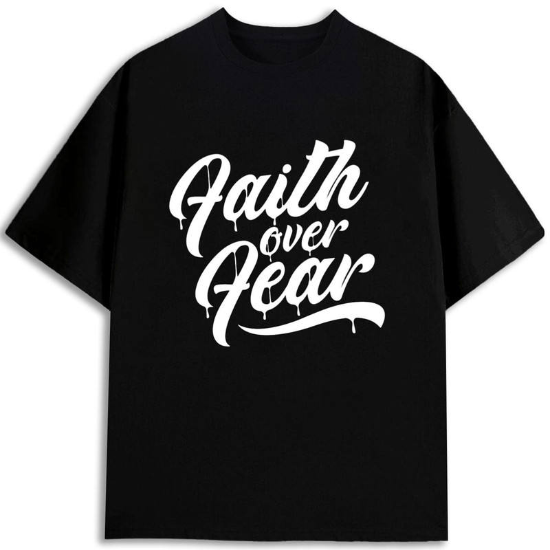 เสื้อยืด Faith Over Fear ผู้ชาย ผ้าฝ้าย 100% ทรงปกติ แขนสั้น พิมพ์ลายสกรีน คอกลม สีดำ 180 กรัม