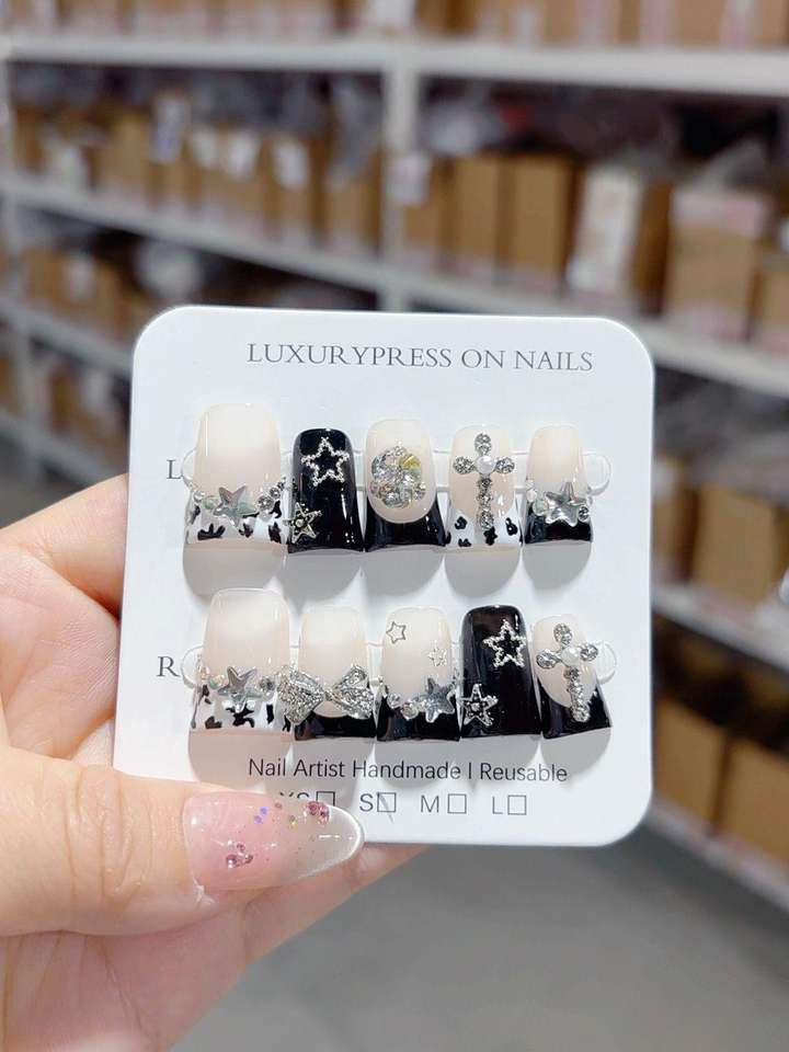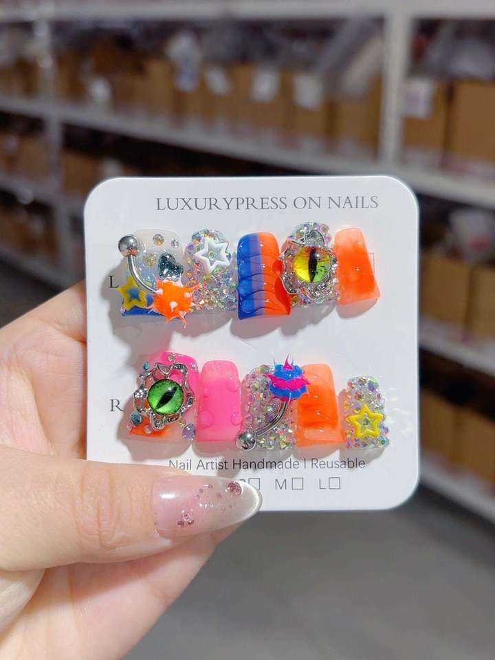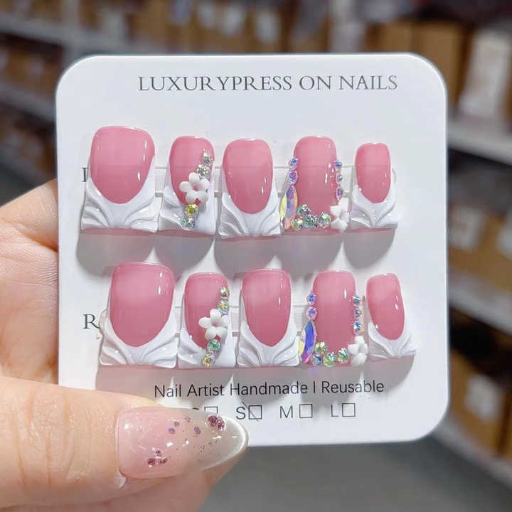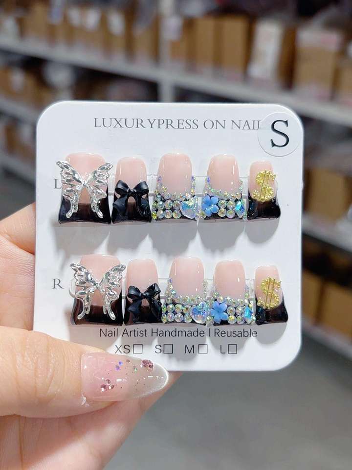 เล็บปลอมแบบกดติด คุณภาพสูง ลายเป็ดฝรั่งเศส ทำจาก ABS ปิดเต็มเล็บ พร้อมลายสำเร็จรูป 10 ชิ้น ประดับด้วยเพชรพลอยสีเขียวมรกต สำหรับร้านทำเล็บ