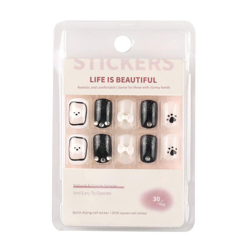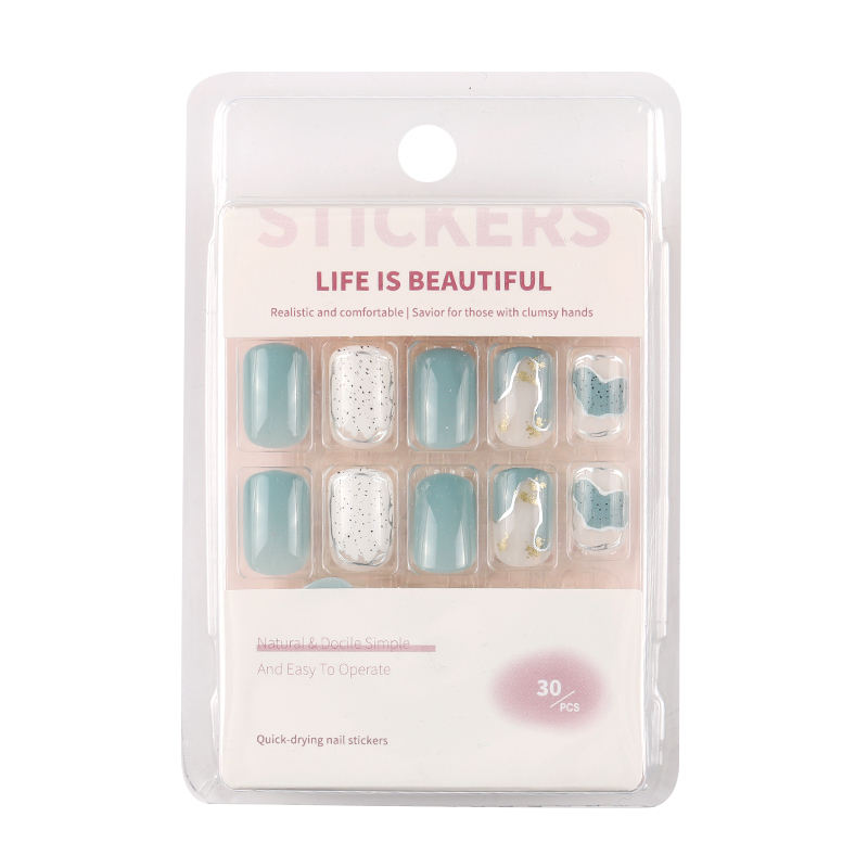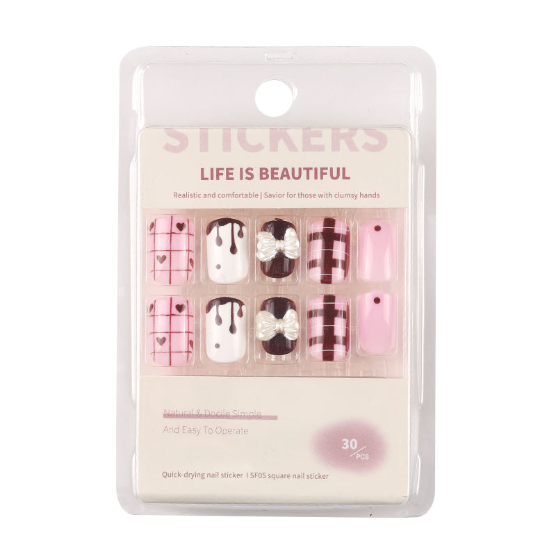 ชุดเล็บปลอมพร้อมกาว คุณภาพระดับร้านทำเล็บ วัสดุ ABS แบบเต็มเล็บ ลายสี่เหลี่ยม สติ๊กเกอร์เจลลี่ ลายสำเร็จรูป ปลายเล็บยาว/กลาง
