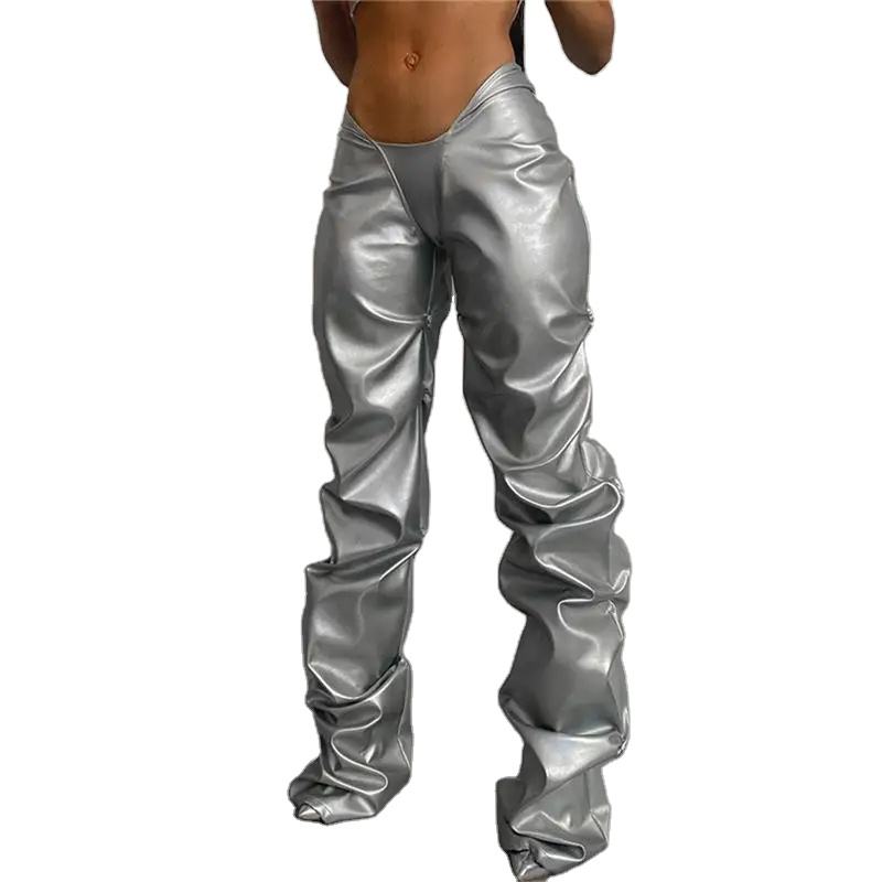 กางเกงเอวสูงหนัง PU แบบเรียงซ้อนสำหรับผู้หญิงกางเกงผู้ชายคุณภาพสูงกางเกงแฟชั่นหนังลายทางโค้งตรงฤดูใบไม้ร่วง