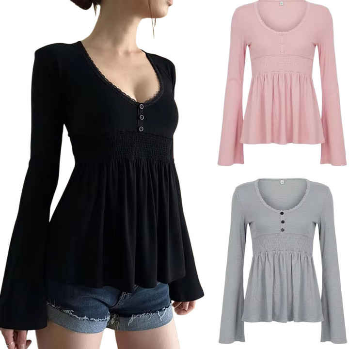 Solid Color Simple A-Line V Neck Lace Cute Women's Loose Casual Long Sleeve T-Shirt