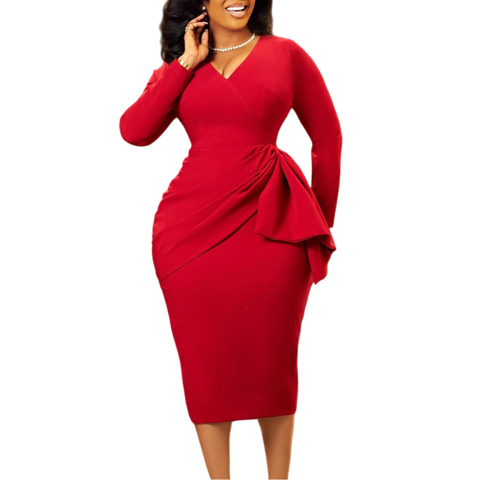 แฟชั่นฤดูใบไม้ร่วง/ฤดูหนาว ชุดเดรสทรงเข้ารูป คอวี แขนยาว สีพื้น แต่งระบาย สำหรับใส่ทำงาน สไตล์แอฟริกันสำหรับผู้หญิง