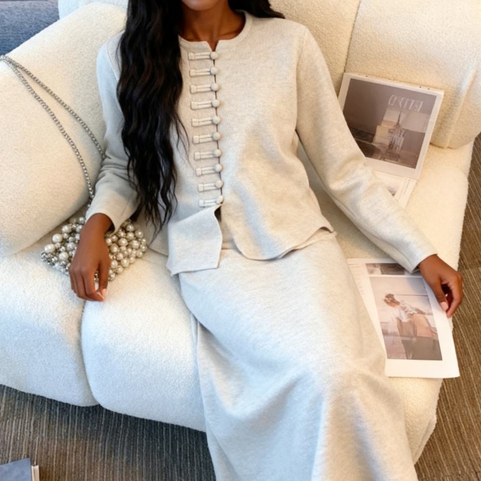 ชุดเซ็ต 2 ชิ้น เสื้อสเวตเตอร์ติดกระดุมสไตล์จีนสำหรับผู้หญิง คอลเลคชั่นใหม่ประจำฤดูใบไม้ร่วง/ฤดูหนาว พร้อมกระโปรงสีพื้น แฟชั่น