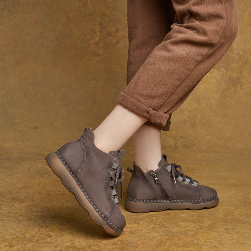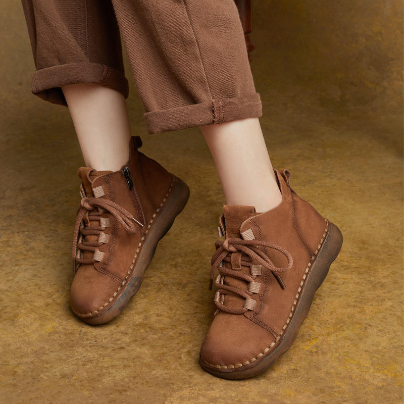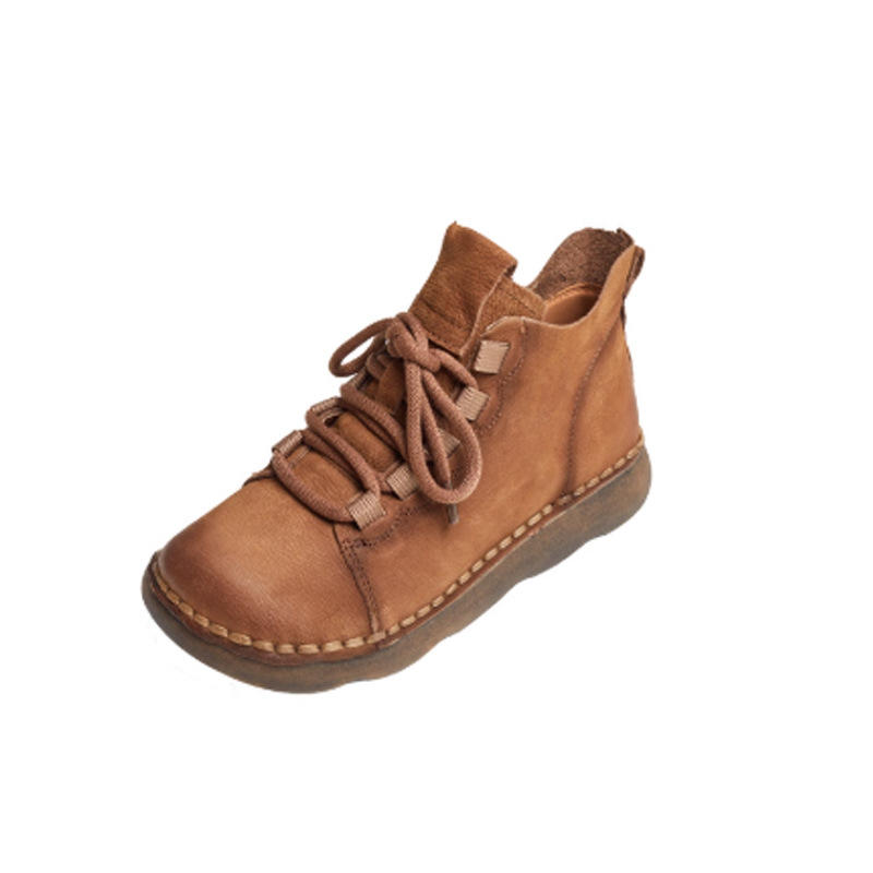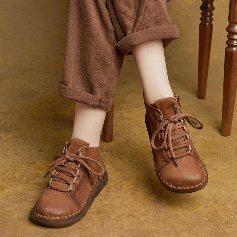 รองเท้าบูทหุ้มข้อหนังแท้สไตล์เรโทรใหม่สำหรับฤดูใบไม้ร่วงและฤดูหนาว ส้นแบน ปิดหัวรองเท้า ผูกเชือก พื้นนุ่ม ใส่สบาย
