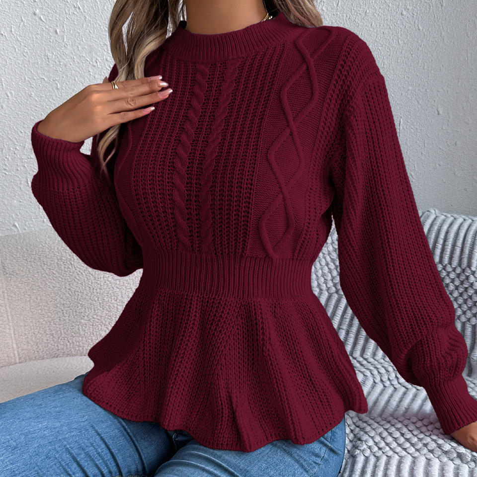 เสื้อสเวตเตอร์แขนยาวสีพื้นแบบมีระบายช่วงเอวสำหรับฤดูใบไม้ร่วง/ฤดูหนาวแฟชั่น