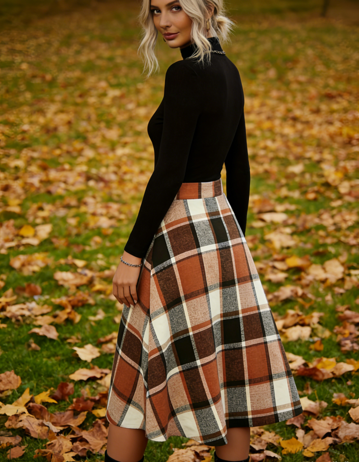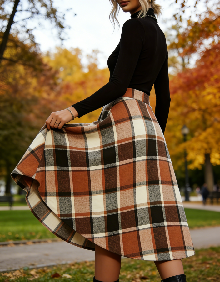 กระโปรงทรงเอพลีทลายตารางสไตล์วินเทจสำหรับฤดูใบไม้ร่วงและฤดูหนาว ไซส์พลัส ความยาวระดับเข่า เอวธรรมชาติ สำหรับผู้หญิง