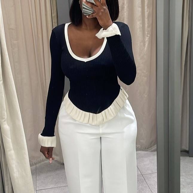 เสื้อถักลายปะติดสำหรับผู้หญิงช่วงฤดูใบไม้ร่วง พร้อมชายเสื้อและแขนเสื้อระบายแฟชั่น