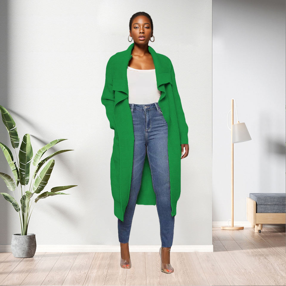 เสื้อโค้ทฤดูใบไม้ร่วงฤดูหนาวแบบลำลอง สีพื้น ผ้าถัก คาร์ดิแกนยาวสำหรับผู้หญิง ผลิตจากโพลีเอสเตอร์รักษ์โลก แฟชั่น