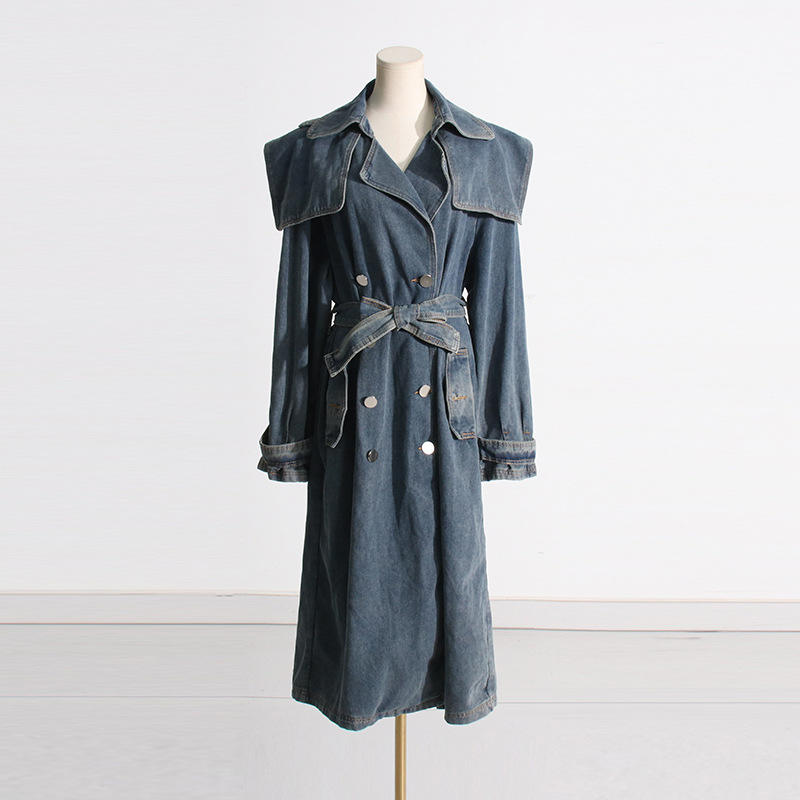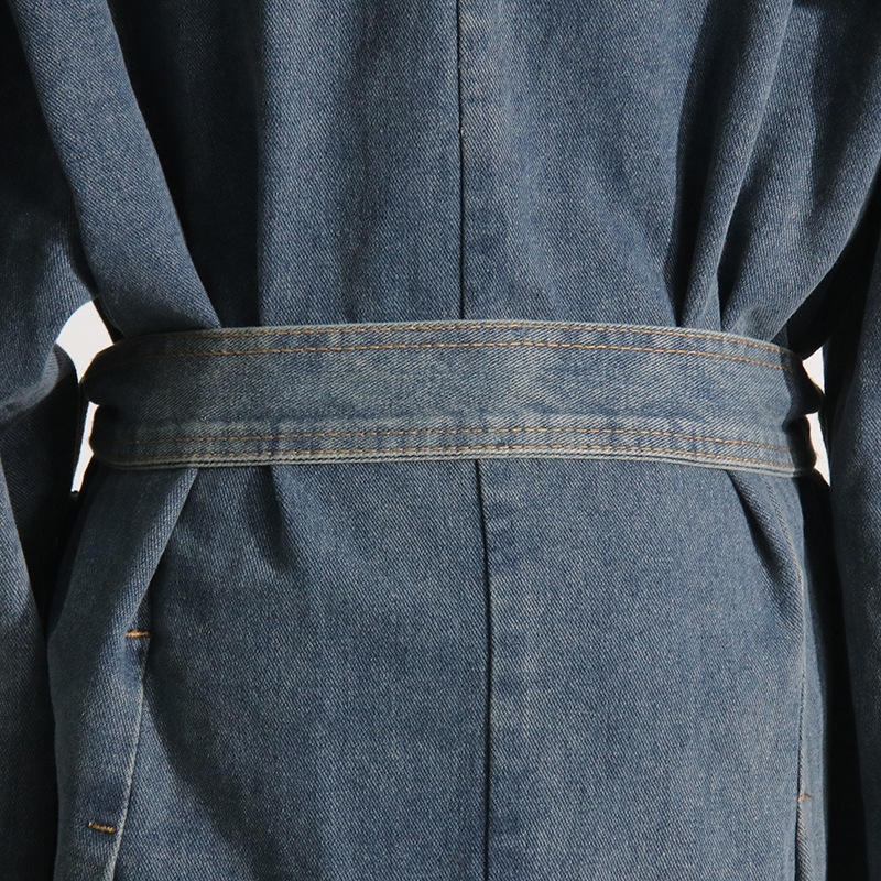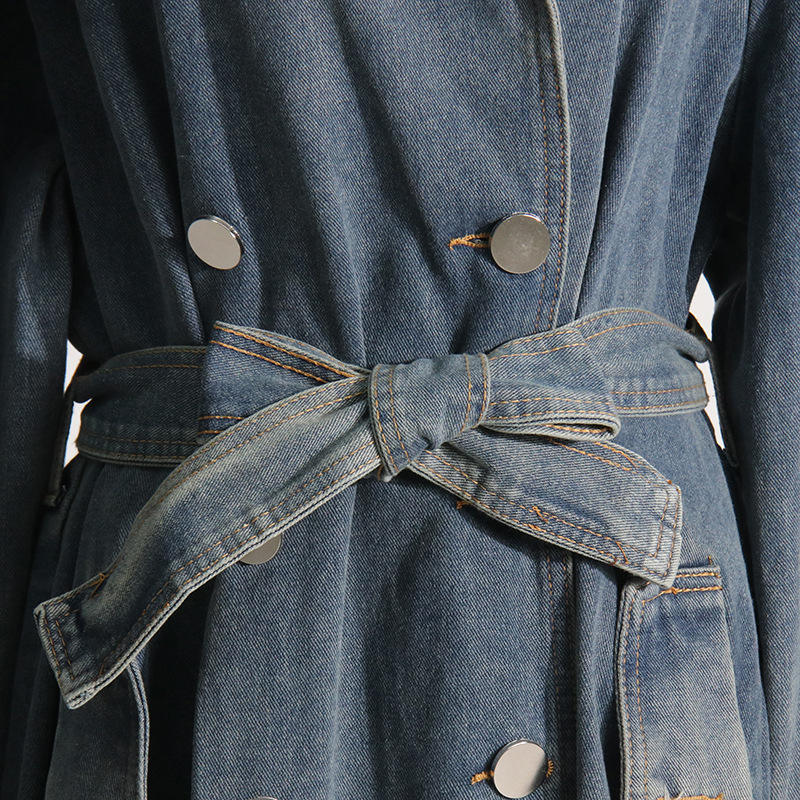 เสื้อโค้ทแจ็กเก็ตผ้ายีนส์คอพับลงเข็มขัดแฟชั่นสำหรับผู้หญิงฤดูใบไม้ร่วงและฤดูหนาว