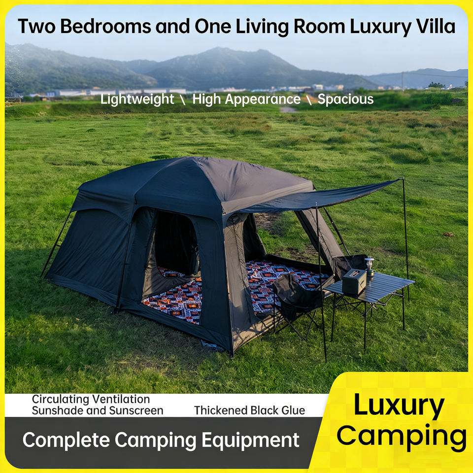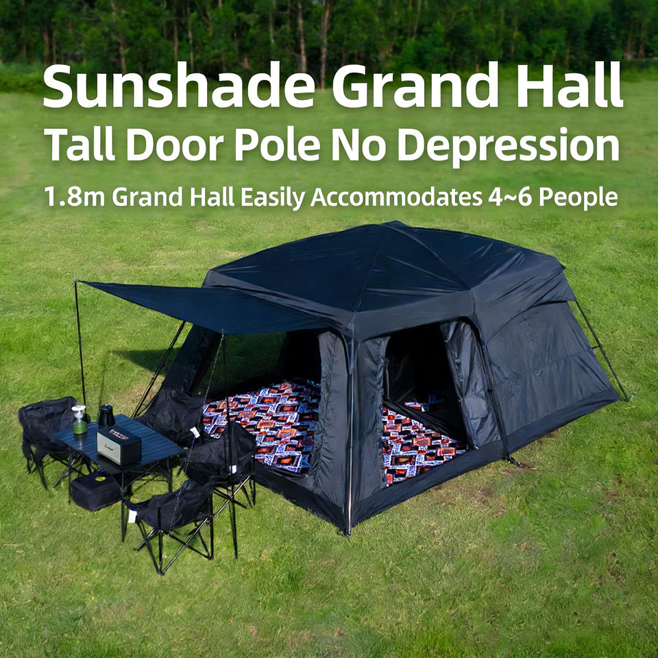 เต็นท์แคมป์ปิ้งสำหรับครอบครัว เต็นท์วิลล่าสุดหรู พร้อมผ้ากันแดด 210D UPF50+ พร้อมห้องพักพิงขนาด 1.8 ม.
