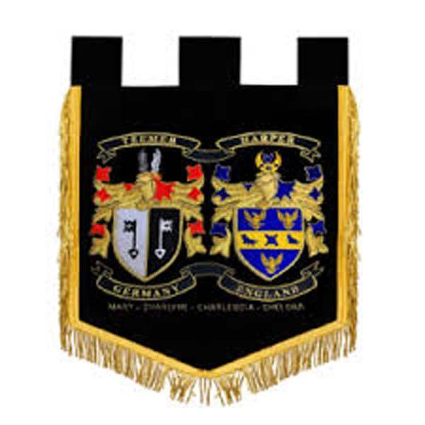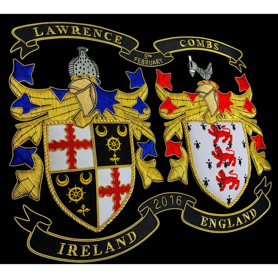 ลายปักตราประจำตระกูลแบบลูกไม้ ปักมือ พร้อมกรอบแบบกำหนดเอง (ติดกระดุม) ด้วยด้ายไหมทอง สำหรับใช้เป็นของที่ระลึก