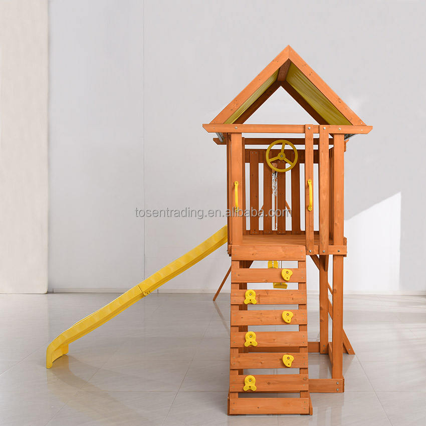 ชุดชิงช้าไม้สำหรับครอบครัวพร้อมบ้านเล่น สไลเดอร์สีเหลือง และหินปีนป่าย สำหรับสวนหลังบ้าน