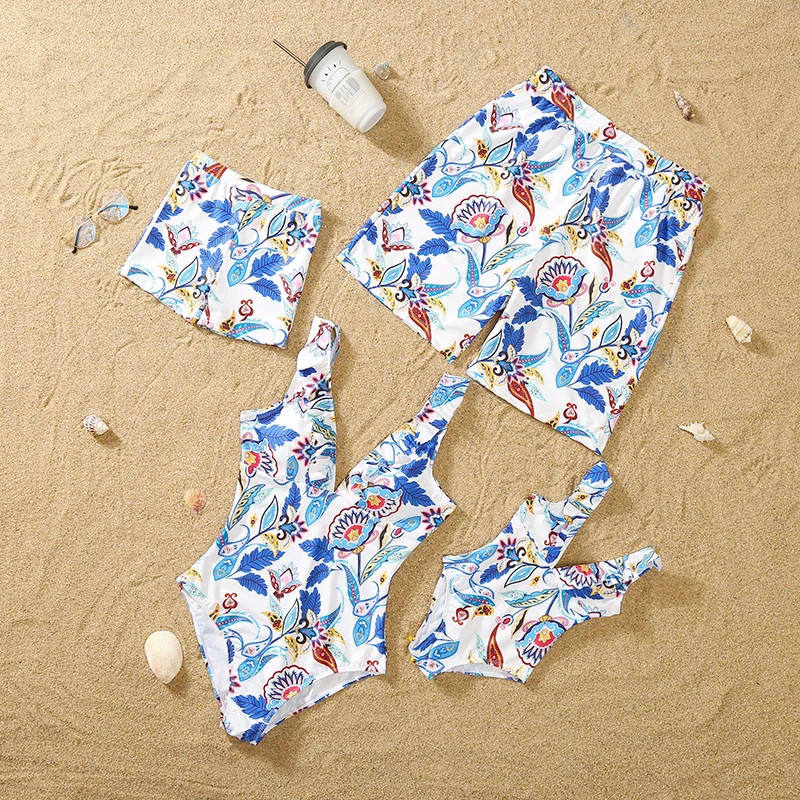 Family Matching Floral Printed Swimsuits Cozy Outfits for Quality Time at Beach or Pool