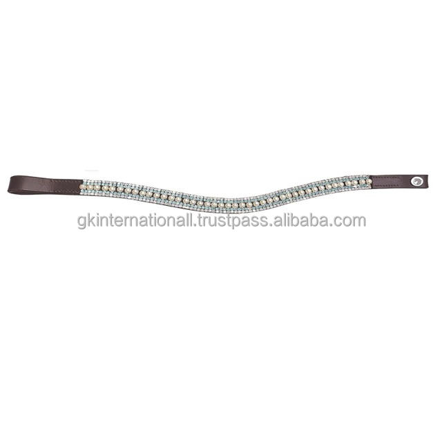 แถบคิ้วหนังสีดำแฟนซีตกแต่งด้วยไข่มุกสีฟ้าและสีขาวด้วยคริสตัลใสสายรัดคิ้วบังเหียนม้า