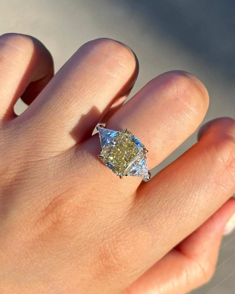 แฟนซีสี Lab ปลูกเพชรสามหินแหวนหมั้น 3.00 Ctw Radiant Cut Canary สีเหลืองแหวนเพชรทองคําขาวงานแต่งงาน VS1