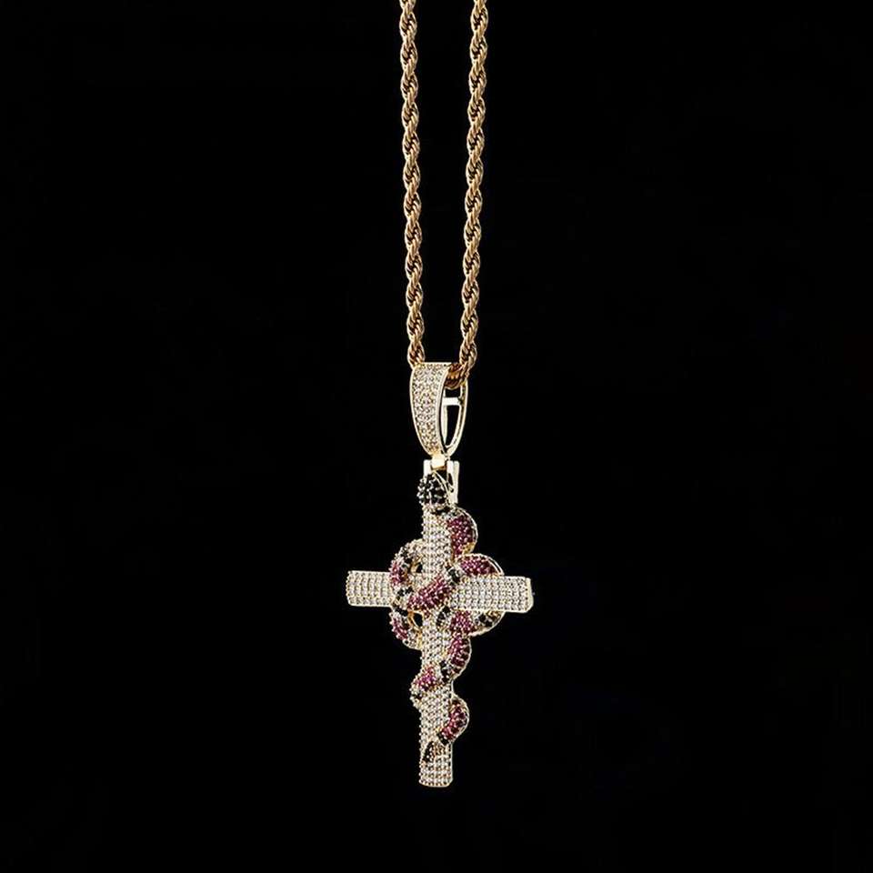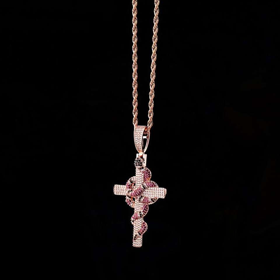 จี้รูปไม้กางเขนประดับมอยส์ซาไนต์สีชมพูรูปงู เครื่องประดับจี้และชาร์มสุดหรู จี้ชาร์มแบบ Iced Out ของขวัญสำหรับเขา